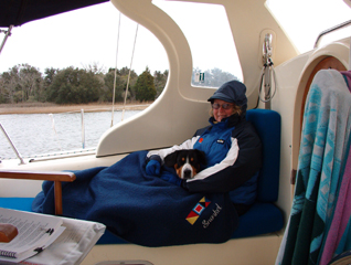 | When it got really cold we had on foul weather gear over sweaters and squall jackets. In this picture, Lynn finds extra warmth under a blanket with Toby. | |
