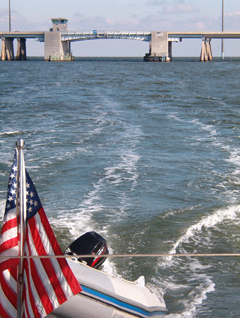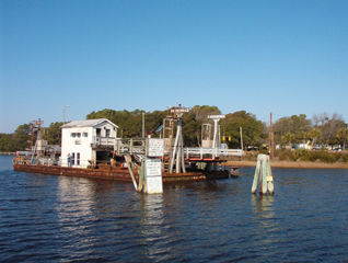 | Except for the inconvenience of restricted openings, we loved the bridges of the ICW. This is one of the oldest and most historic. It is a pontoon bridge in which the center portion is towed out of the gap by cable. | |