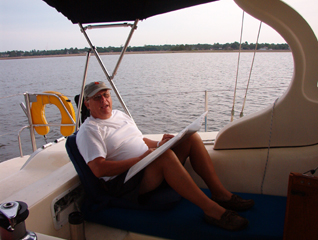 | Navigating in the ICW is a lot more involved activity than one would think. Here George is checking our location, distance to the next bridge, and the speed we need to make for the next scheduled opening. | |