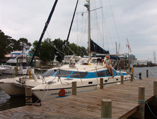 | We transited the ICW north bound as well, but made much better time. We were within 3 hours of our home marina when we decided to make the cruise last one more night. Here we are at the Oriental town dock on our last evening. |