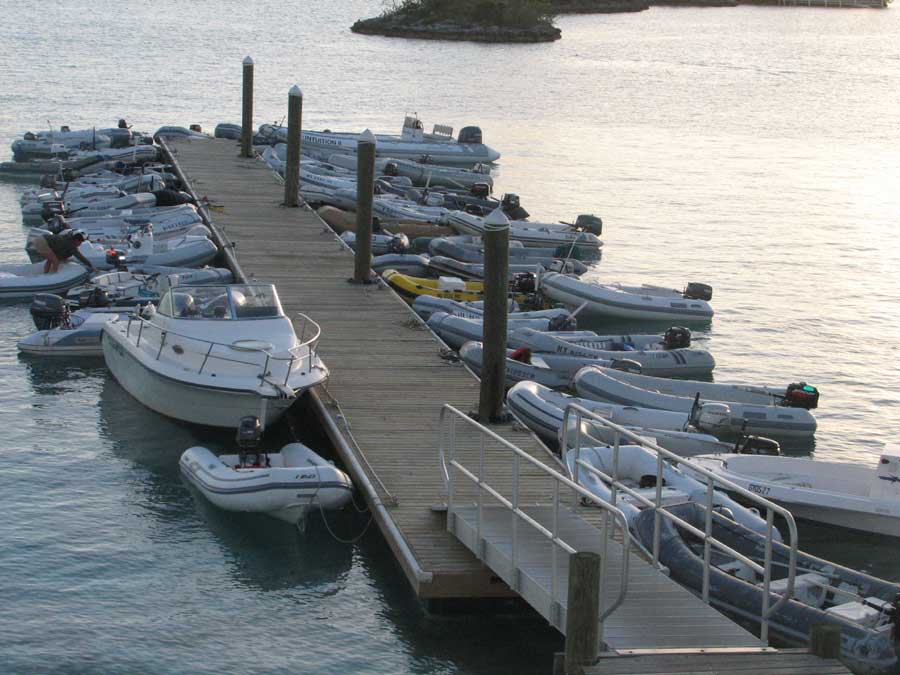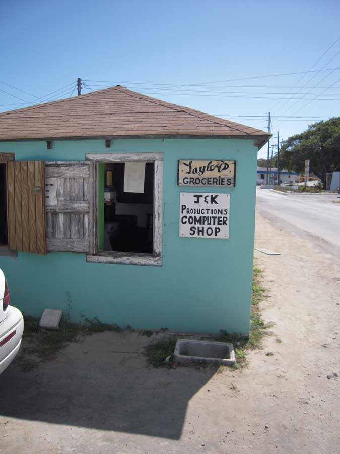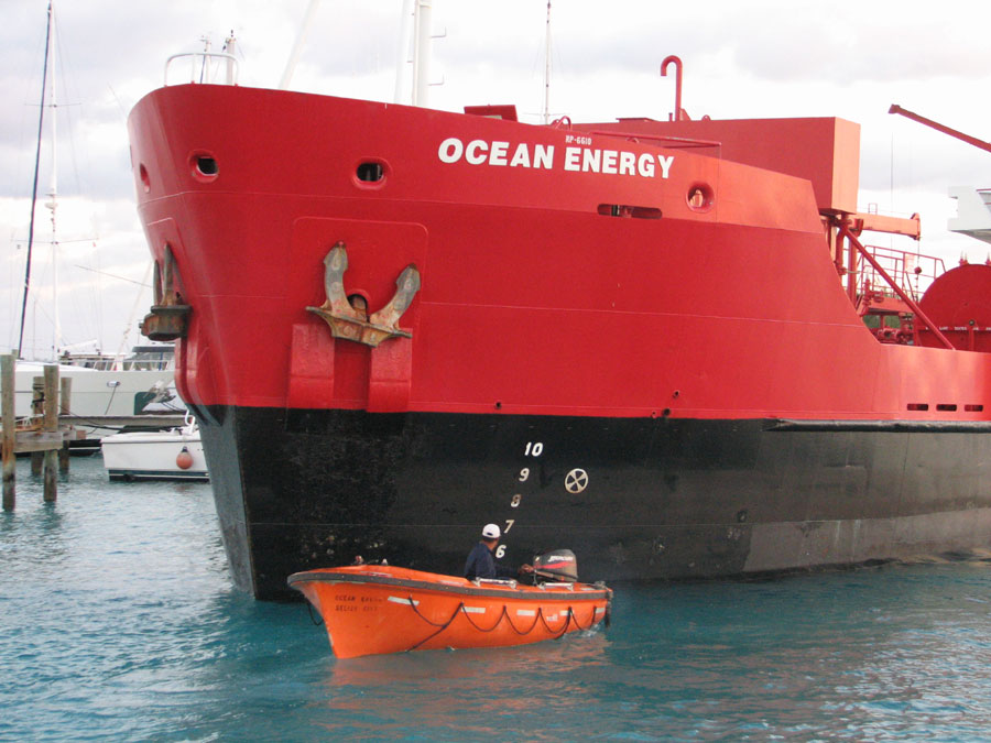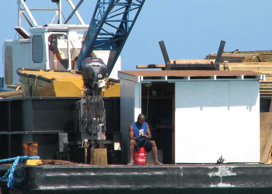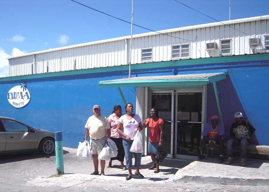 items shipped in. A tug and barge are tied to the dock. A Bahamian barge