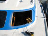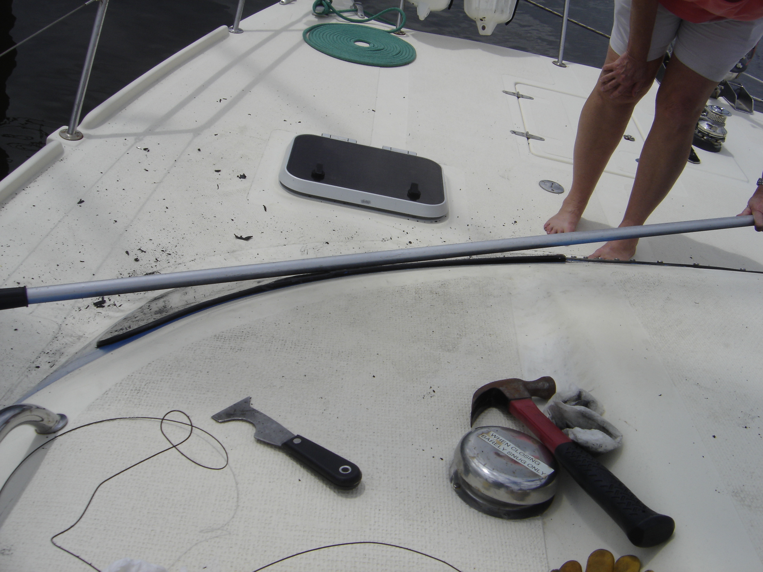 | This shows how much curve there is on the two "corner" windows. Lynn holds a boat hook to compare to something straight. Photo was taken after we realized than no matter what we tried, we would be unable to save and reuse old windows. Deck is littered with pieces of the old adhesive/sealant. In the foreground are some of the instruments we tried to remove old window. Wire worked for a few inches, but is hard to use and keep straight. If cut is not true it cuts into FRP. Putty knife was a loser. Broke hack saw blade but it too worked for a few inches. Even our most delicate efforts resulted in cracking the old plexi. | |