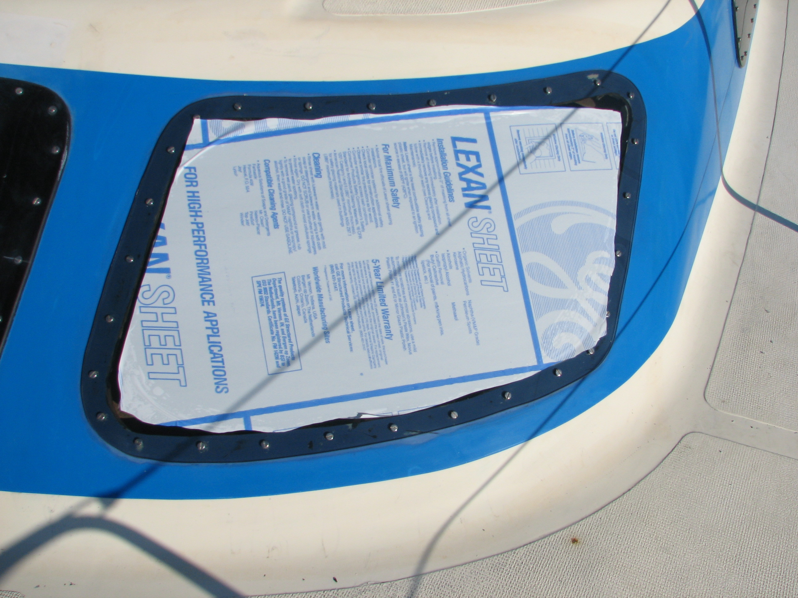 | I chose to go with new fasteners. Old were .6mm metric, new 1/4-20, slightly larger. To align pane, we drilled from inside 1/4 holes and mounted the pane with no adhesive as in photo. Then we removed and drill all holes oversize (9/32) allow for thermal expansion and counter sunk both sides to reduce stress. | |